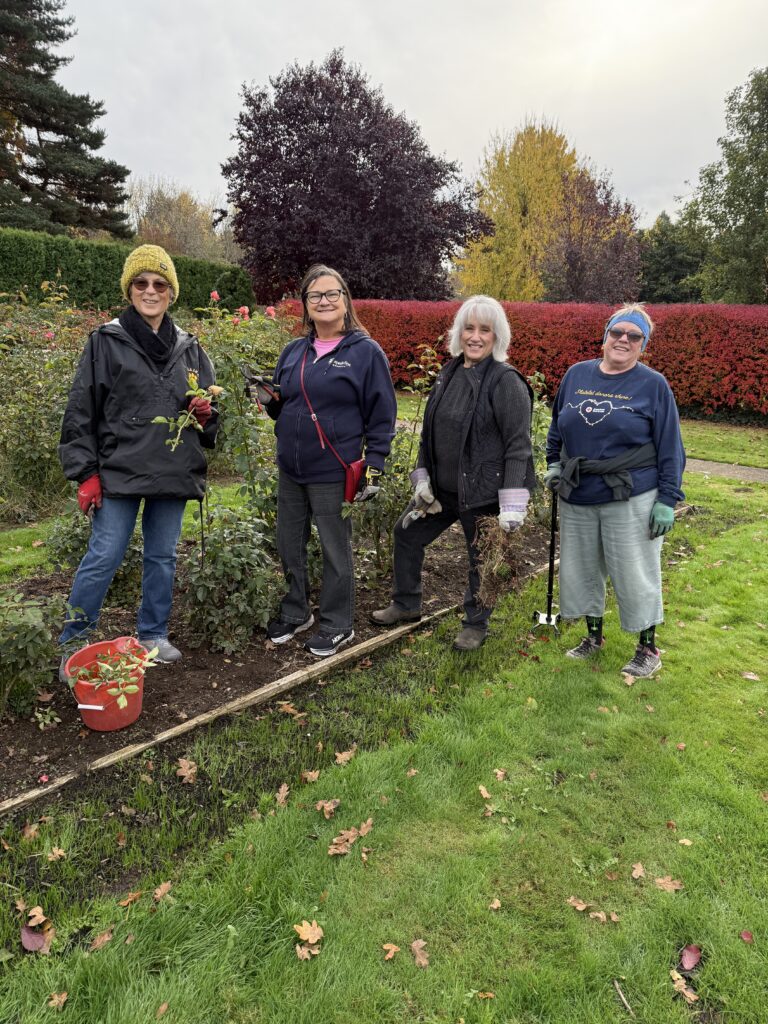 Here’s a photo of some of our club members helping to clean up the Sara Hite Rose Garden at the Milwaukie Community Center. Thanks for volunteering your time and doing the hard work (l to r) Wendy, Priscilla, Julie, and Patti!